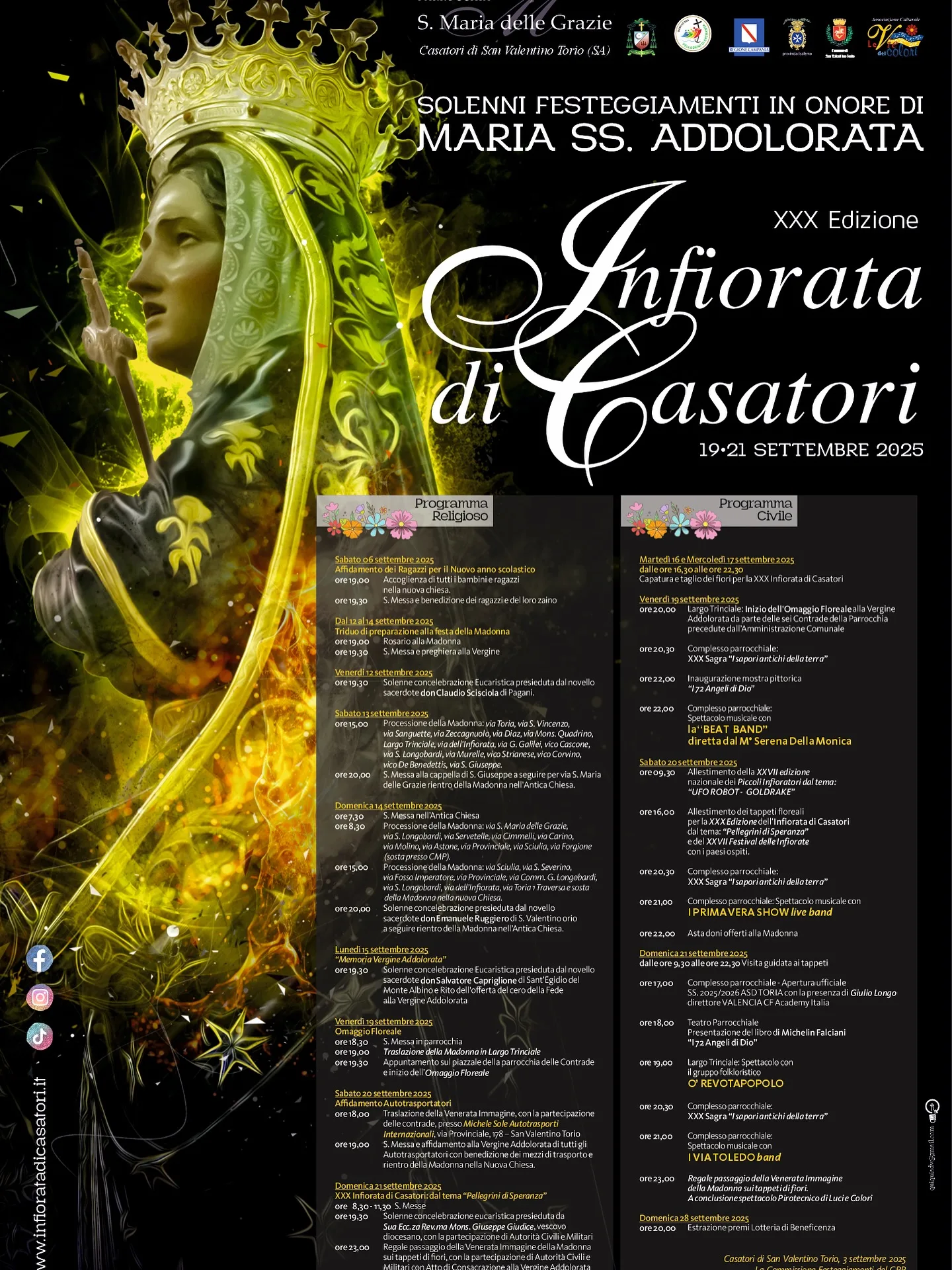 La XXX edizione dell’Infiorata di Casatori a San Valentino Torio, un appuntamento che coniuga arte, fede e devozione, si terrà dal 19 al 21 settembre. Come da tradizione, nella terza domenica di settembre, la comunità “Santa Maria delle Grazie” di Casatori si prepara a rinnovare l’omaggio alla Vergine Addolorata. Al centro della frazione si realizzano tappeti floreali che si ispirano ad un tema religioso che, ogni anno, viene deciso dall’Associazione culturale “Le Vie dei Colori”, nata proprio con l’intento di promuovere e valorizzare questa particolare forma d’arte.