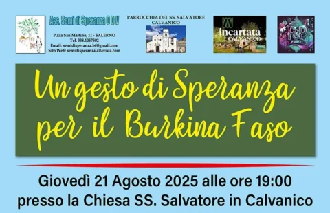 Giovedì 21 Agosto 2025 alle ore 19:00 presso la Chiesa SS. Salvatore in Calvanico ci sarà la celebrazione Eucaristica con cena di beneficenza all'Incartata per donare speranza ed aiuto alle