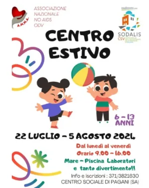 L’associazione Sodalis e l’associazione nazionale No AIDS, organizzano un centro estivo a Pagani dal 22 luglio al 5 agosto. Le attività si svolgeranno presso il centro sociale di Pagani dalle ore 9:00 alle ore 16:00.