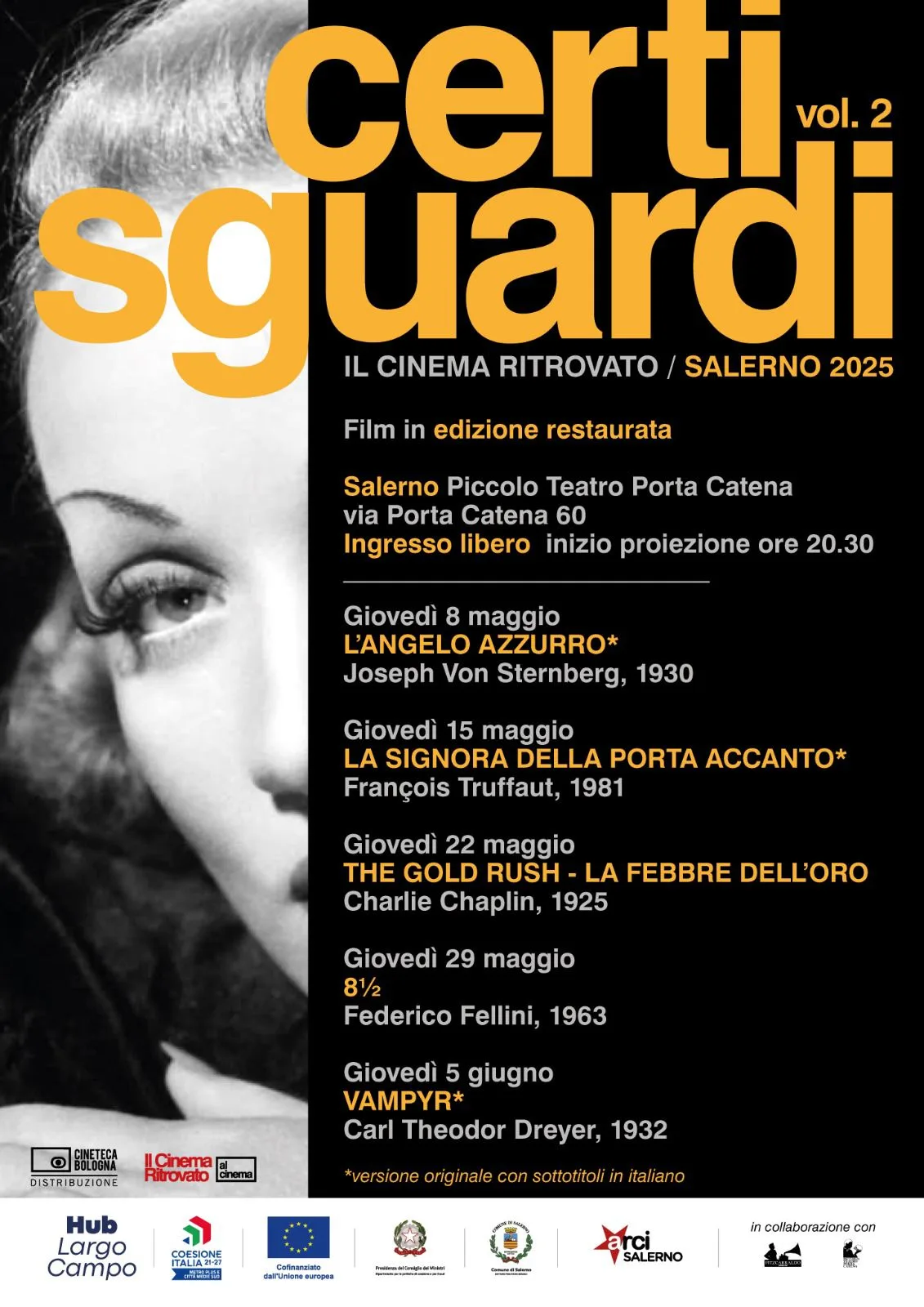 Al via tra pochi giorni “Certi sguardi” volume 2 , la seconda edizione della rassegna di film classici restaurati al Piccolo Teatro Porta Catena, una proposta dell’Hub Largo Campo del Comune di Salerno, a cura di Arci Salerno, in collaborazione con la Cineteca di Bologna e il Fitzcarraldo cineclub, circolo Arci.