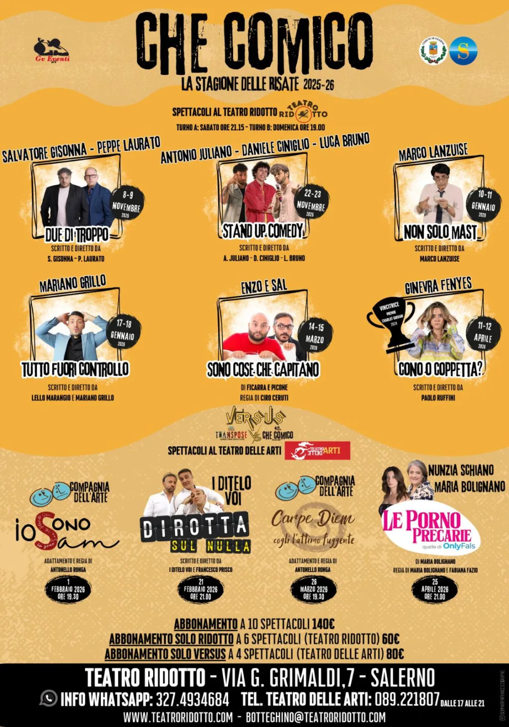 La risata è contagiosa, e quest’anno a Salerno torna più forte che mai con una stagione di Che Comico ideata dalla Gv Eventi di Gianluca e Valentina Tortora che promette di trasformare il pubblico in protagonista assoluto. Ancora una volta due i palcoscenici coinvolti, il Teatro Ridotto e il Teatro delle Arti, e una formula che raddoppia l’esperienza: da un lato la tradizione del cartellone del Ridotto, con sei spettacoli che portano in scena i volti più amati della comicità campana, dall’altro la sfida “Versus” al Teatro delle Arti, quattro appuntamenti in cui la Compagnia dell’Arte reinterpreta e reinventa grandi testi teatrali, misurandosi a colpi di talento con nomi di richiamo della scena nazionale.