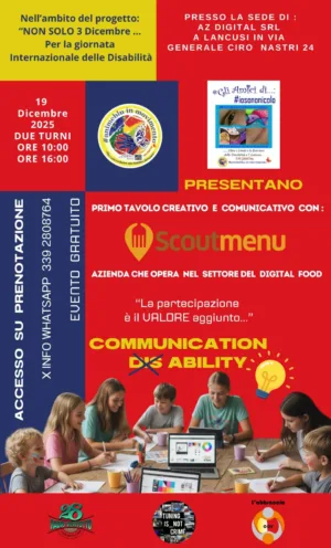 Il 19 DICEMBRE 2025 ore 10:00 e ore 16:00, presso AZ DIGITAL Srl, in Via Generale Ciro Nastri, 24 Lancusi, l’Ass.ne #Gli Amici di #iosononicolo, #anime blu in movimento, grazie a Scoutmenu e partners solidali, nell’Ambito del Progetto “NON SOLO 3 DICEMBRE” anche quest’anno presenta un Evento Gratuito, Unico, Innovativo ed Inclusivo.