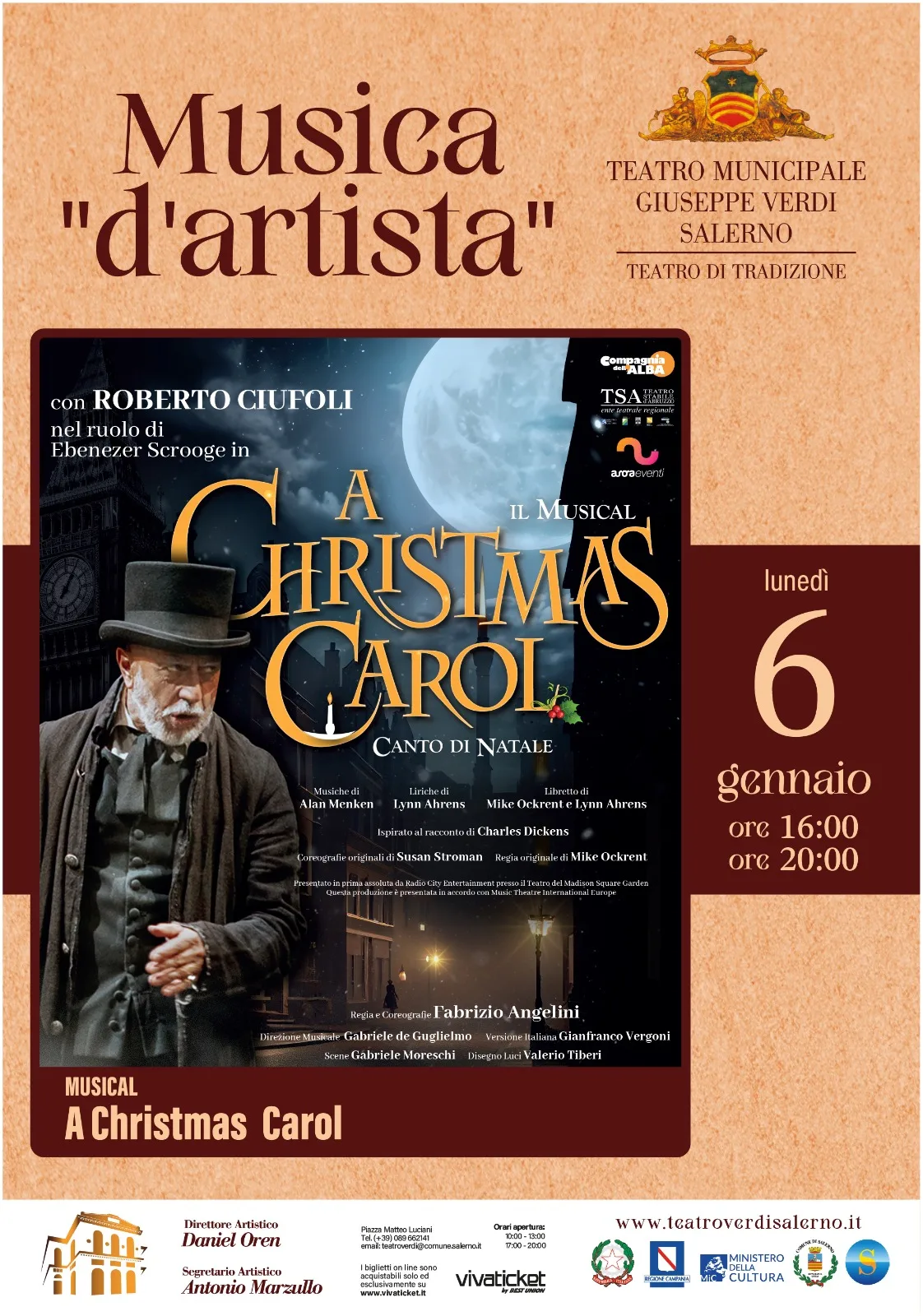 Lunedì 6 gennaio, doppio appuntamento (ore 16.00 e ore 20.00) con il musical: A Christmas Carol. È la vigilia di Natale nella Londra del 1843, e tutti si accingono a festeggiare la ricorrenza. Solo il vecchio usuraio Ebenezer Scrooge, Roberto Ciufoli, mal sopporta questa festività, e chiusa la sua bottega si reca solitario verso la propria dimora.