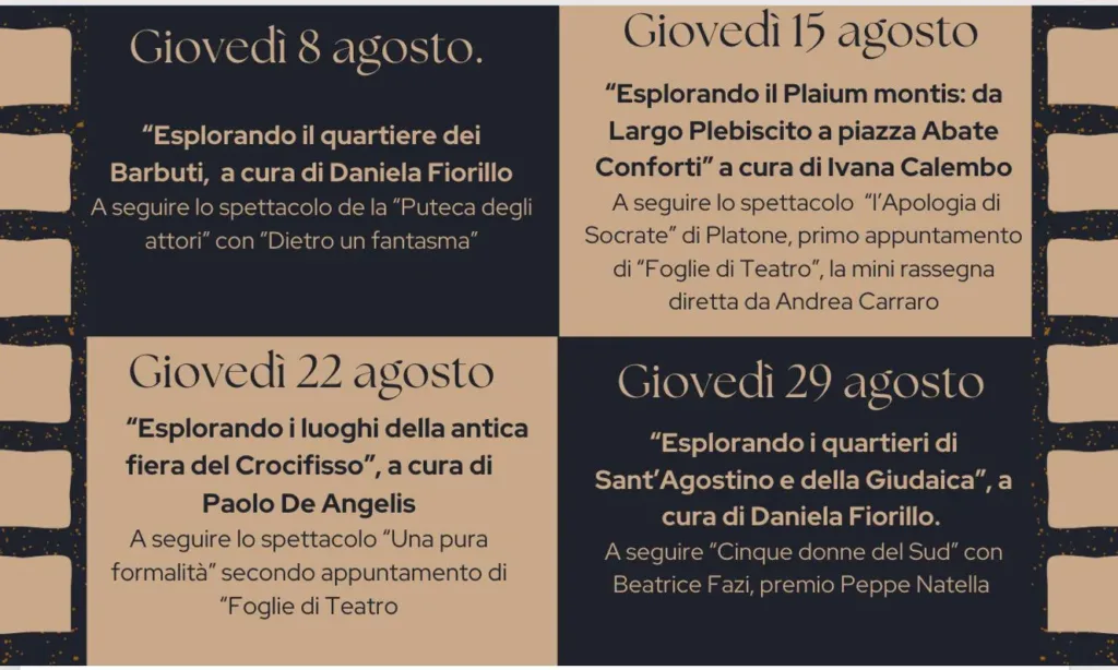 I prossimi appuntamenti dei percorsi organizzati dall’associazione Erchemperto sono previsti per giovedì 22 agosto con la passeggiata “Esplorando i luoghi dell’antica Fiera del Crocifisso” a cura di Paolo De Angelis e a seguire “Una pura formalità” secondo spettacolo di “Foglie di teatro” e per giovedì 29 agosto con la passeggiata “Esplorando i quartieri di Sant’Agostino e della Giudaica” a cura di Daniela Fiorillo e lo spettacolo “Cinque donne del sud” con l’attrice salernitana Beatrice Fazi, alla quale verrà conferito il Premio Peppe Natella.