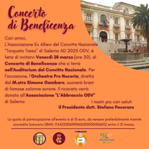 Venerdì 28 marzo alle ore 20:00 presso l’Auditorium del Convitto Nazionale Torquato Tasso Salernoci sarà il “Concerto di Beneficenza” con l’ orchestra Pro Nuceria, diretta dal maestro Simone Gambaro.