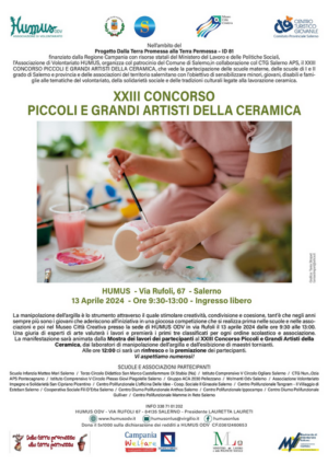 Una mostra e la premiazione dei primi tre classificati, per le diverse categorie scolastiche ed associazioni partecipanti, per la XXIII edizione del concorso piccoli e grandi artisti della ceramica, organizzato dall’associazione Humus di via Rufoli a Salerno, nell’ambito del progetto “dalla terra promessa alla terra permessa”. La manifestazione si svolgerà dalle 9 alle 13, previsti anche laboratori di manipolazione e l’esibizione di maestri tornianti ed un rinfresco . Per informazioni è possibile contattare il 338 71 01 202