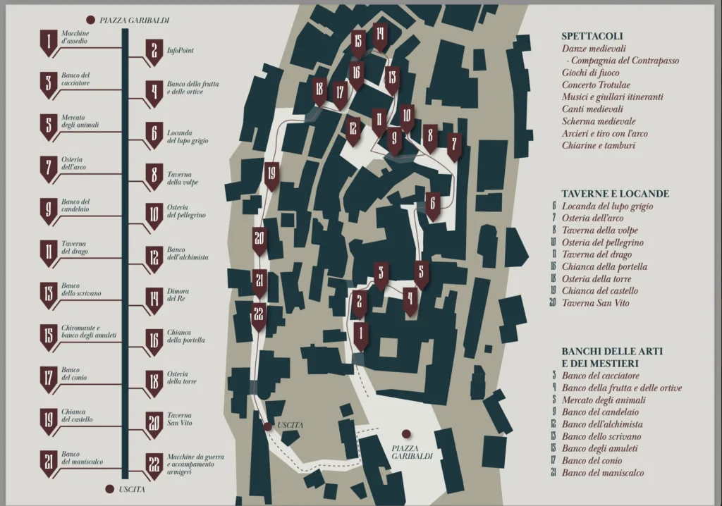 All’interno delle mura, la vita quotidiana prenderà forma: artigiani e mercanti animano le strade, con rievocazioni di antichi mestieri come il maniscalco, l’alchimista, il cacciatore, il candelaio e il notaio. Sabato sera alle ore 20 nella chiesa del Santissimo Nome di Gesù si esibirà l’Ensemble di musica medievale Le Trotulae, proponendo un repertorio di musiche medievali. Domenica pomeriggio, alle ore 17,30, la compagnia di danze storiche Il Contrapasso terrà un seminario di danza medievale, per poi esibirsi alle 19 nel “Gran Ballo del Medioevo”