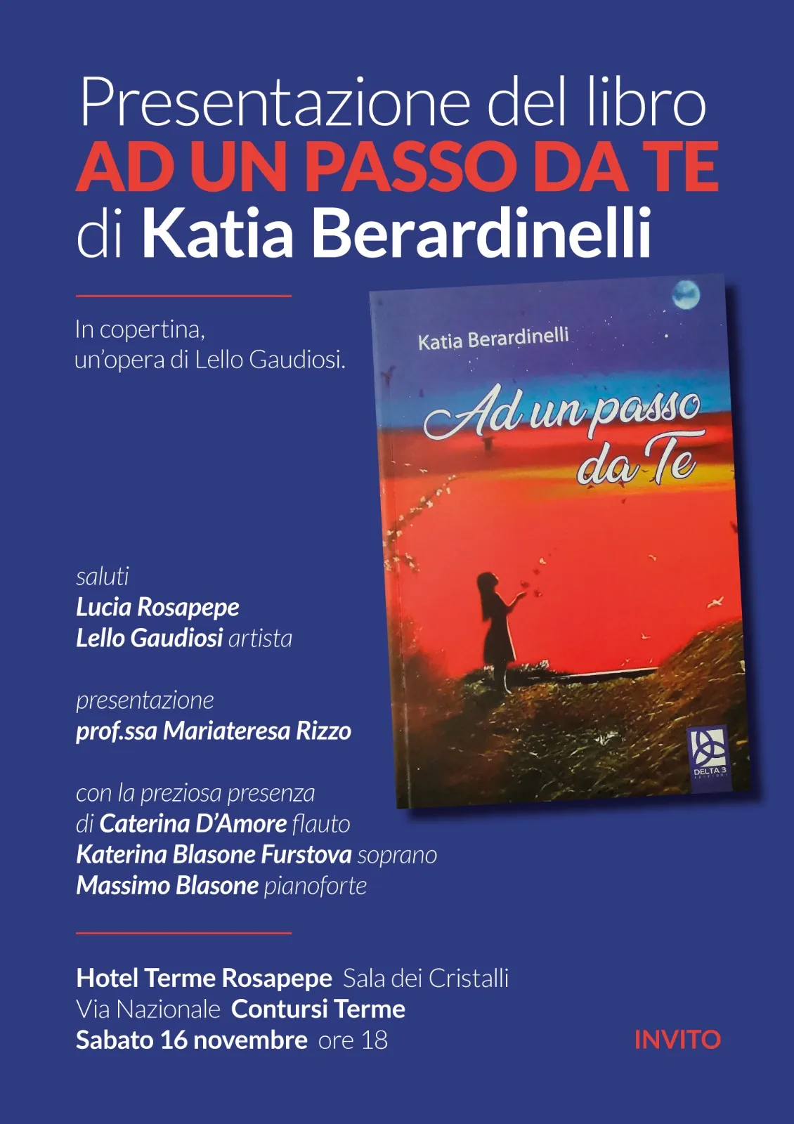 “Ad un passo da te” è il titolo del libro scritto da Katia Berardinelli che sarà presentato sabato 16 novembre alle 18 nella sala dei Cristalli dell’hotel Terme Rosapepe a contursi terme. Il libro, che ha in copertina un’opera dell’artista ambientalista Lello Gaudiosi, che sarà presente alla serata, sarà presentata dalla professoressa Maria Teresa Rizzo. Si ricorda che parte del ricavato della vendita del libro andrà in beneficenza al reparto di terapia subintensiva neonatale del Santobono di Napoli e per l’acquisto di materiale didattico per i bambini ricoverati nel reparto oncologico Pausillipon. La serata sarà allietata dall’esibizione della soprano Katerina Blasone Furstova accompagnata dal flauto di Caterina D’Amore e da Massimo Blasone al pianoforte.
