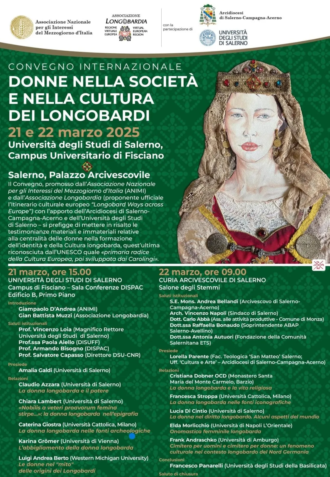 organizzato dall’Associazione Nazionale per gli Interessi del Mezzogiorno d’Italia (ANIMI) e dall’Associazione Longobardia, insieme con l’Arcidiocesi di Salerno- Campagna-Acerno e l’Università degli Studi di Salerno. Puntando i riflettori sul ruolo delle mulieres longobarde, l’iniziativa – ospitata nella prima giornata presso l’Unisa e nella seconda presso la Curia Arcivescovile- mira a fornire spunti di riflessione “di genere”, focalizzando l’attenzione su fasi storiche fondamentali nell’evoluzione della condizione femminile.