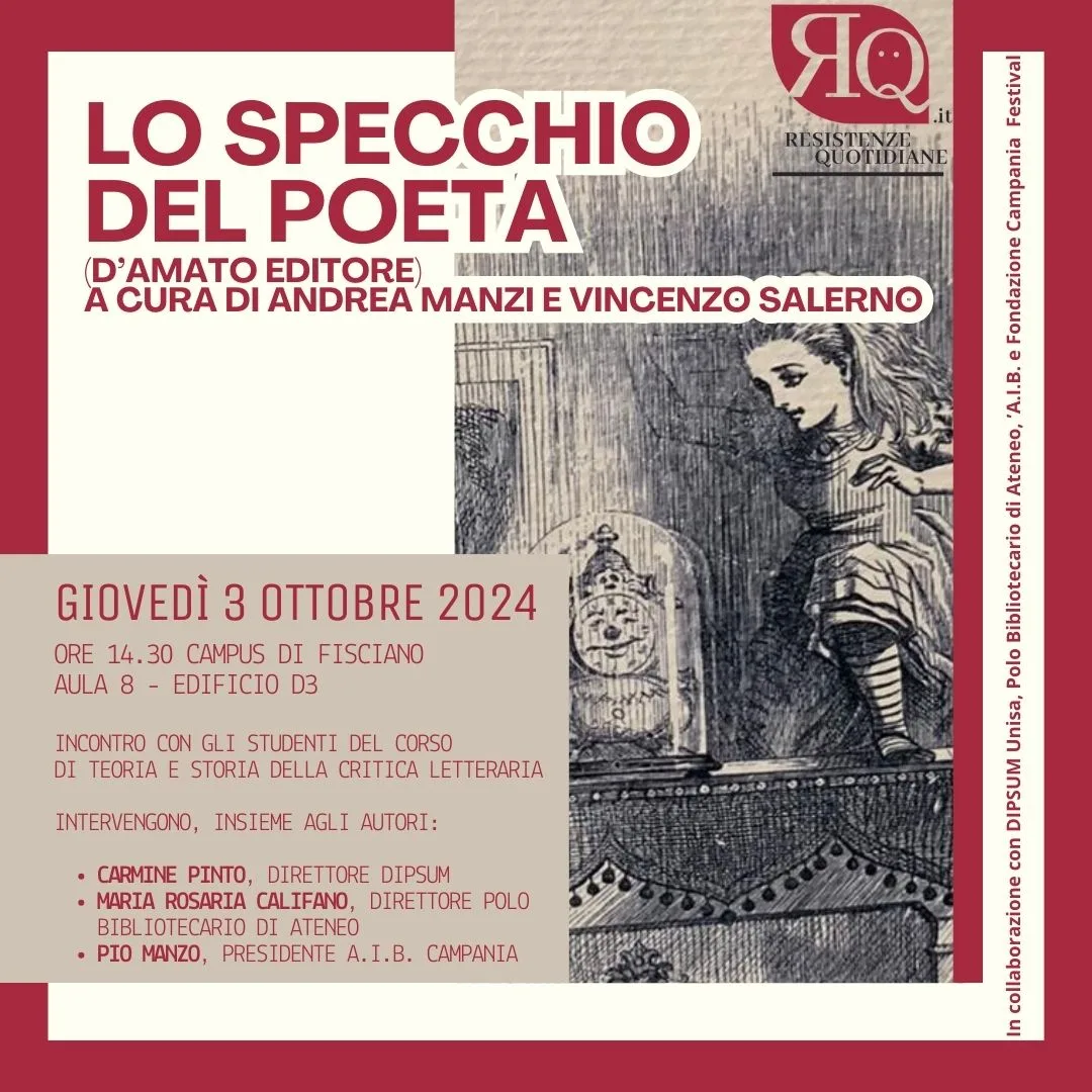 Lo specchio del poeta, l’innovativa rubrica di poesia di Vincenzo Salerno, appuntamento fisso per i lettori del magazine Resistenze Quotidiane, diventa libro. Il volume, a cura di Andrea Manzi e Vincenzo Salerno (Francesco d’Amato editore, 2024), contiene cento poesie di venti diversi autori e, così come la rubrica on line, curata e ideata dallo stesso Salerno, si propone di “raccontare” la poesia italiana contemporanea attraverso i versi degli autori. Lo specchio del poeta è parte integrante del laboratorio culturale di Resistenze Quotidiane. «La pubblicazione del libro – spiega Andrea Manzi, fondatore di RQ – è la chiusura di un cerchio, il ritorno della poesia alla carta stampata dopo un inedito viaggio nella rete». Il libro Lo specchio del poeta sarà presentato il 3 e 5 ottobre prossimi nel corso di due eventi.