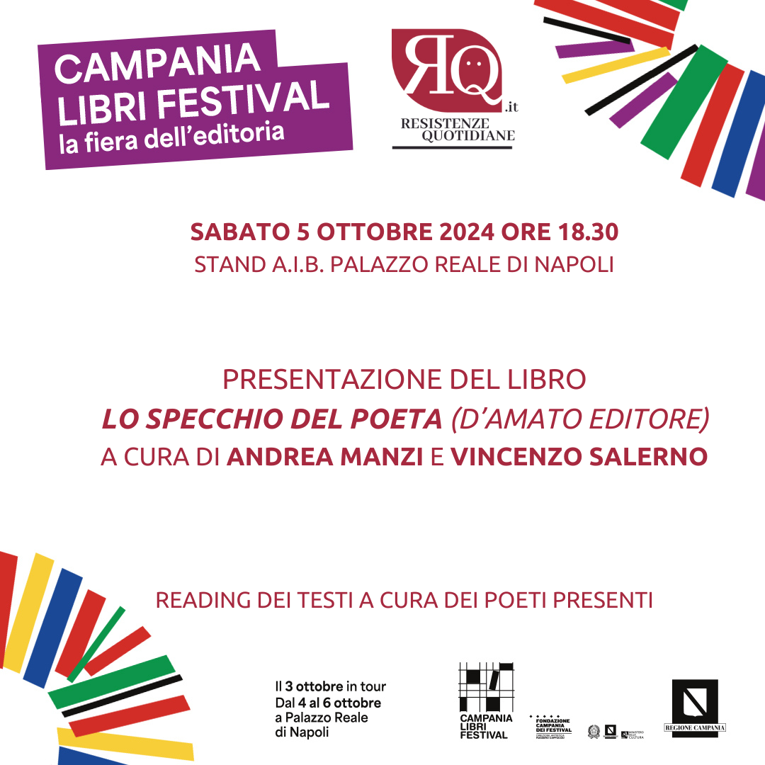 Entrambi gli appuntamenti sono organizzati in collaborazione con il DIPSUM (Dipartimento di Studi Umanistici) dell’Università di Salerno, con il Polo Bibliotecario di Ateneo, con l’A.I.B. (Associazione Italiana Bibliotecari), e con la Fondazione Campania dei Festival. Giovedì 3 ottobre alle ore 14.30 all’Università di Salerno (Aula 8, edificio D3) i curatori del libro, Andrea Manzi e Vincenzo Salerno incontreranno gli studenti del corso di Teoria e Storia della Critica Letteraria. All’evento saranno presenti anche: Carmine Pinto, direttore DIPSUM; Maria Rosaria Califano, Direttrice del Polo Bibliotecario di Ateneo; Pio Manzo, presidente A.I.B. Campania. Sabato 5 ottobre, poi, alle ore 18.30, presso lo stand A.I.B. del Palazzo Reale di Napoli, alla presenza degli autori, ci sarà la presentazione del libro e un reading di testi a cura dei poeti.