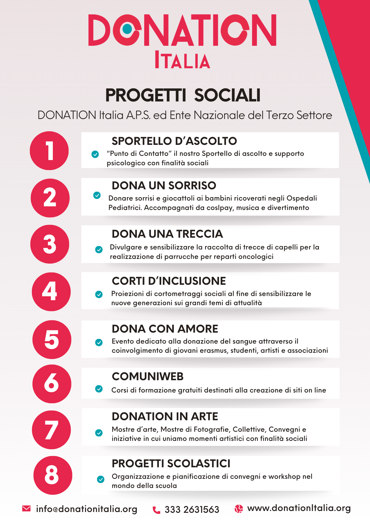 DONATION Italia A.P.S, con sede legale a Salerno, è attiva in diversi campi ed in diversi settori, dal volontariato alla cultura, dalla scuola al mondo della ricerca al settore sanitario.