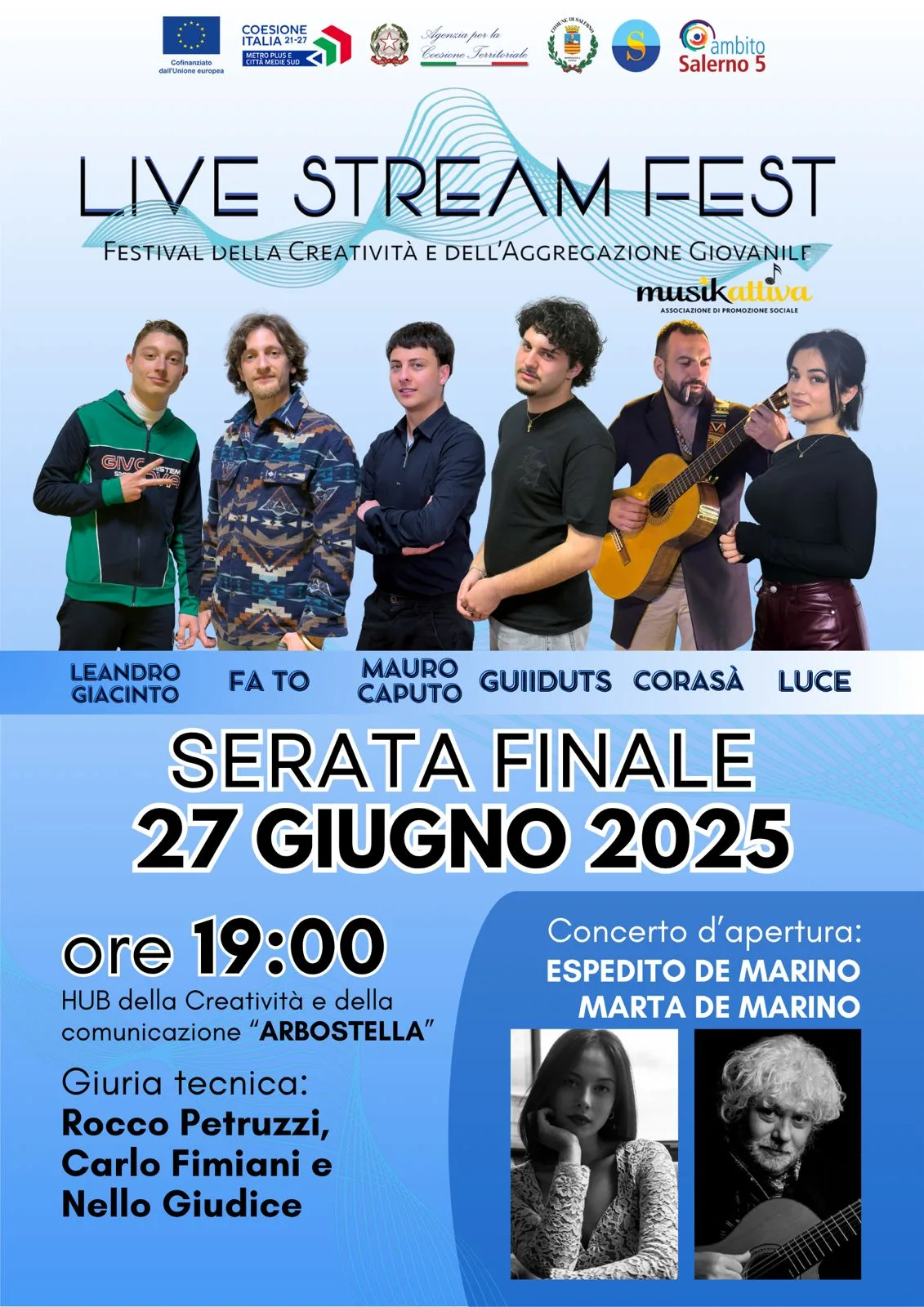 Il 27 giugno, a partire dalle ore 19, l’HUB della Creatività e della Comunicazione “Arbostella” di Salerno ospiterà l’evento finale del Festival della Creatività e dell’Aggregazione Giovanile. Una manifestazione pensata per valorizzare i giovani talenti artistici del territorio, organizzata dall’APS Musikattiva con il sostegno dell’Unione Europea, dell’Agenzia per la Coesione Territoriale e dell’Ambito Salerno 5 – Assessorato alle Politiche Sociali del Comune di Salerno, nell’ambito della programmazione Pon Metro Plus dedicata alle città intermedie.
