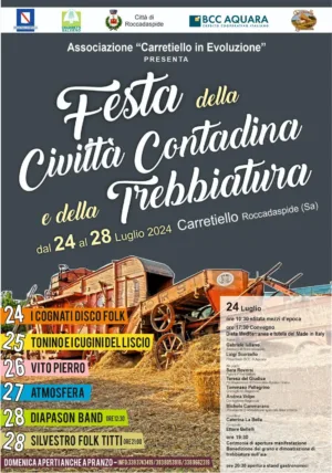 Dal 24 al 28 luglio a Carretiello in Roccadaspide ci sarà la festa della civiltà contadina e della trebbiatura, con musica e vari ospiti.