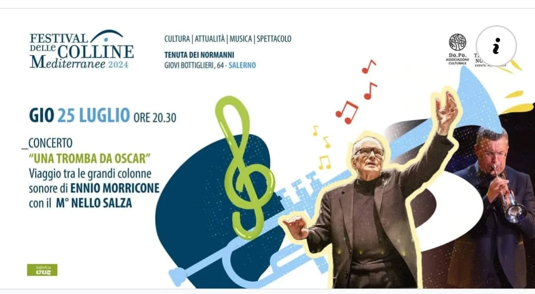 Questa sera alle ore 20:30 con inizio dello spettacolo alle ore 21:00 alla Tenuta dei Normanni, ci sarà un concerto tra le musiche di Ennio Morricone, con il trombettista il Maestro Nello Salza che ha collaborato a più di 200 delle colonne sonore dei suoi celebri film.