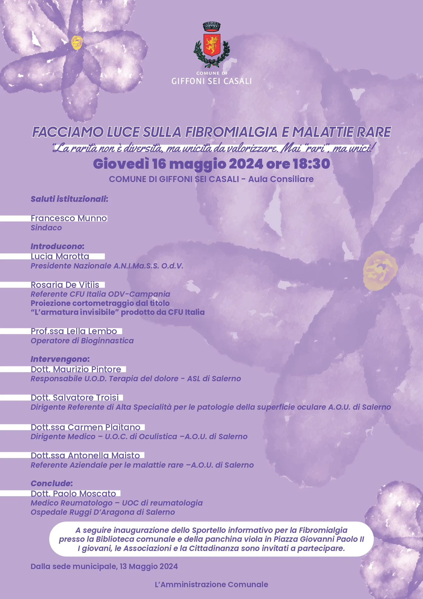 Un evento fortemente voluto dall’Amministrazione comunale guidata dal sindaco Francesco Munno per sensibilizzare l’opinione pubblica sulla Fibromialgia, una malattia che ancora oggi viene troppo spesso trascurata, ma che purtroppo colpisce circa 3 milioni di Italiani con prevalenza di donne, e sulle malattie rare che rappresentano una condizione difficilissima per chi le vive, una lotta, a volte, contro un fantasma senza nome.
