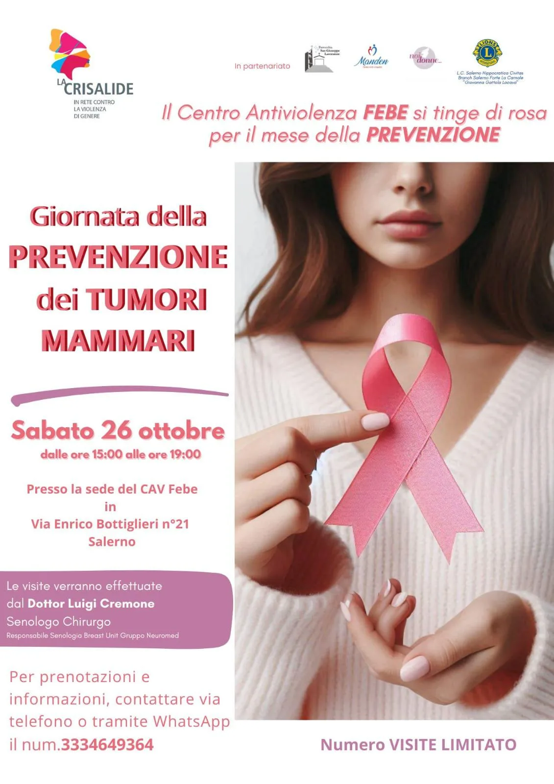 L’appuntamento e per sabato 26 ottobre, dalle 15 alle 19, al numero 21 di via Enrico Bottiglieri a Salerno. L’iniziativa del centro antiviolenza FEBE, nell’ambito del mese della prevenzione dei tumori mammari, metterà a disposizione delle donne le competenze del dottor Luigi Cremone, senologo chirurgo. Per prenotazioni ed informazioni, il numero di visite è limitato, si può contattare via telefono o tramite WhatsApp il numero 333 46 49 364.