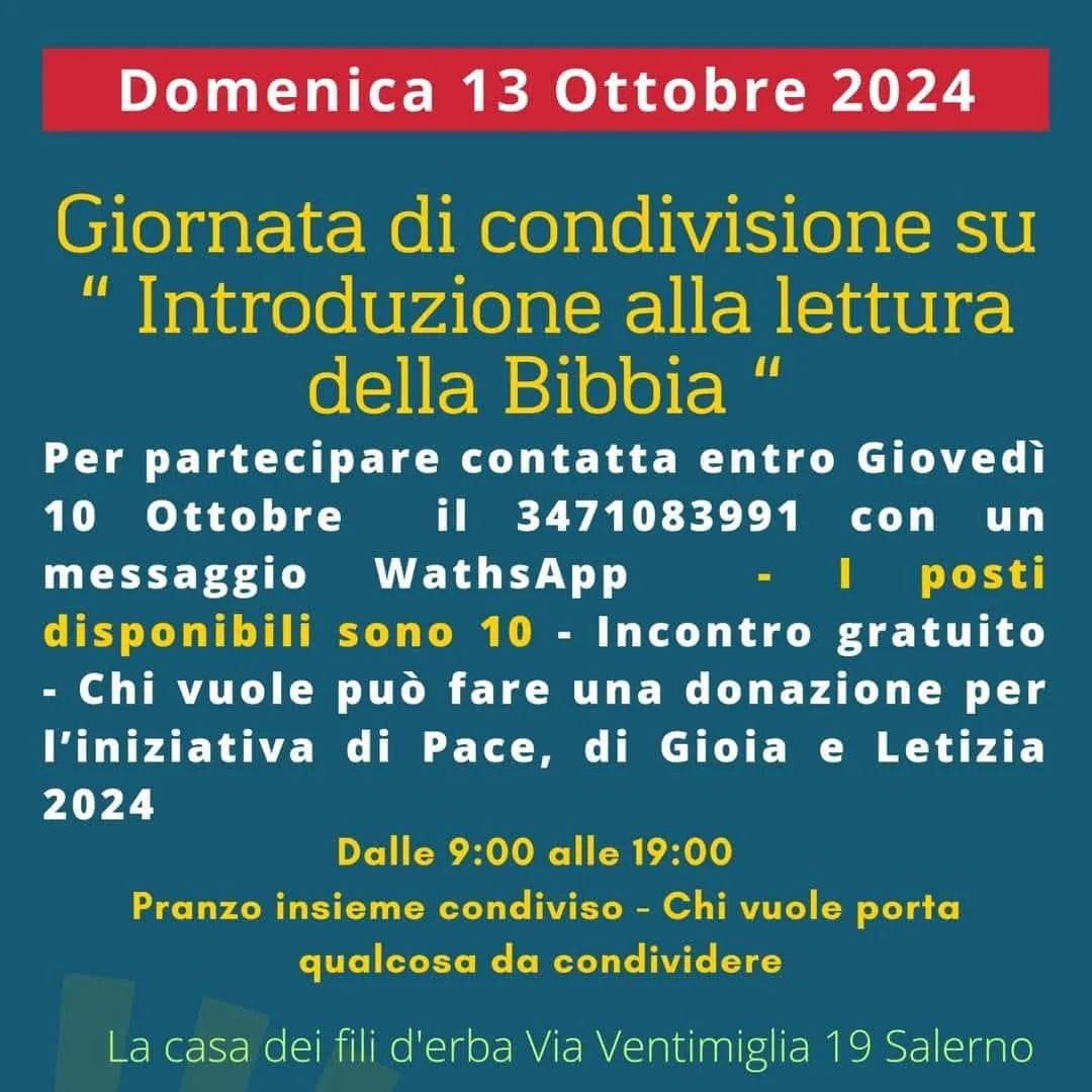 Domenica 13 Ottobre 2024 inizierà la giornata di condivisione su ”Introduzione alla lettura della Bibbia”. L’evento, organizzato dalla Casa dei fili d’erba, inizierà verso le 09:00 con la presentazioni della giornata, per poi continuare con varie riflessioni e condivisioni sui passaggi della bibbia, fino alle 18:00 con le conclusioni finali.