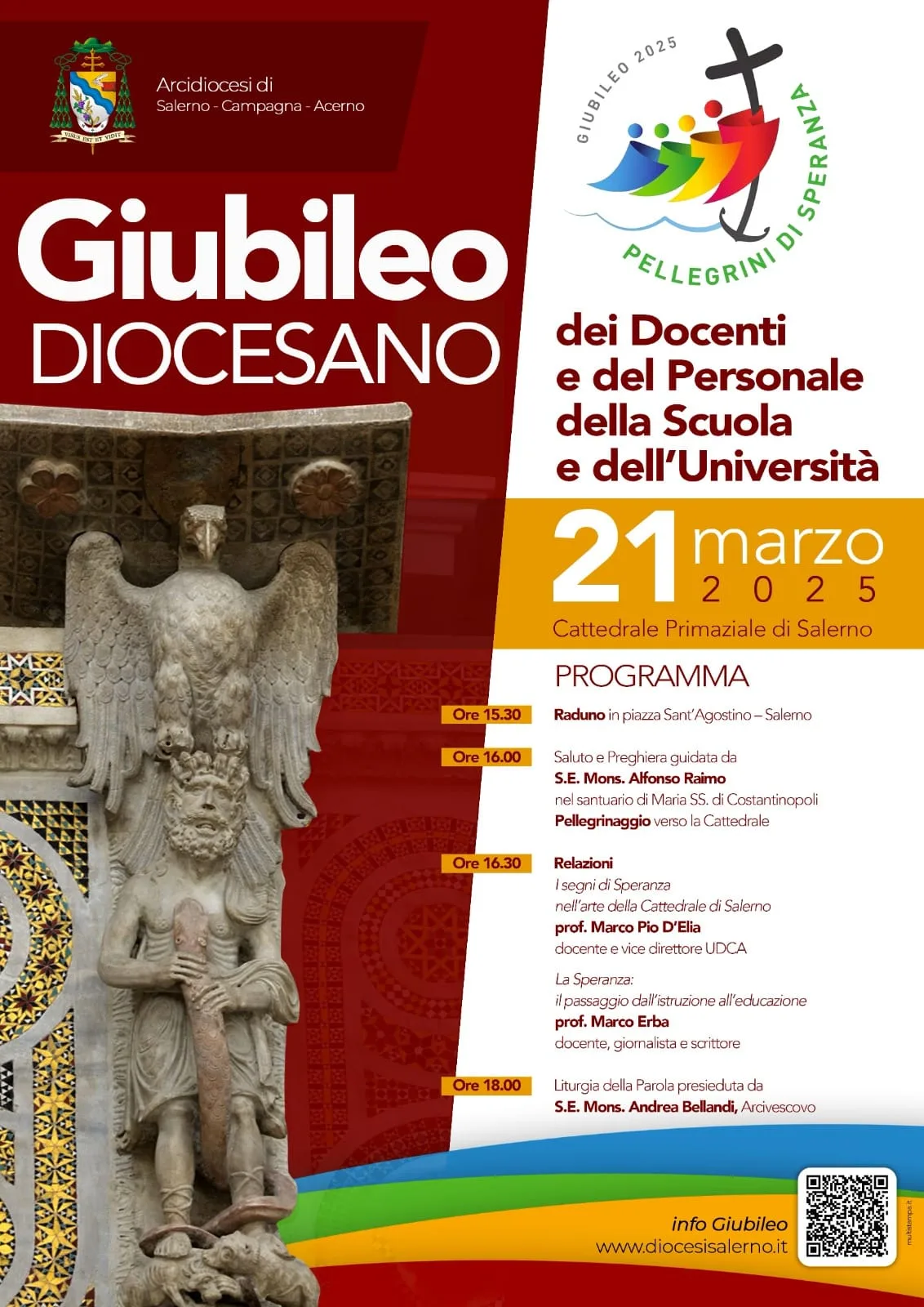 “Rivolgo un caloroso invito a tutti i docenti e al personale della scuola e dell’università a partecipare al Giubileo Diocesano a loro dedicato. – ha aggiunto Don Leandro D’Incecco, Direttore dell’Ufficio Scuola della Diocesi di Salerno- Questo evento non è pensato esclusivamente per i credenti, ma per tutti coloro che desiderano vivere un’esperienza di crescita, confronto e arricchimento. Sarà un momento di formazione che intreccia l’arte, la cultura e la spiritualità, un’opportunità per riflettere insieme sul valore dell’educazione e sul ruolo della speranza nella nostra missione di insegnanti ed educatori”.
