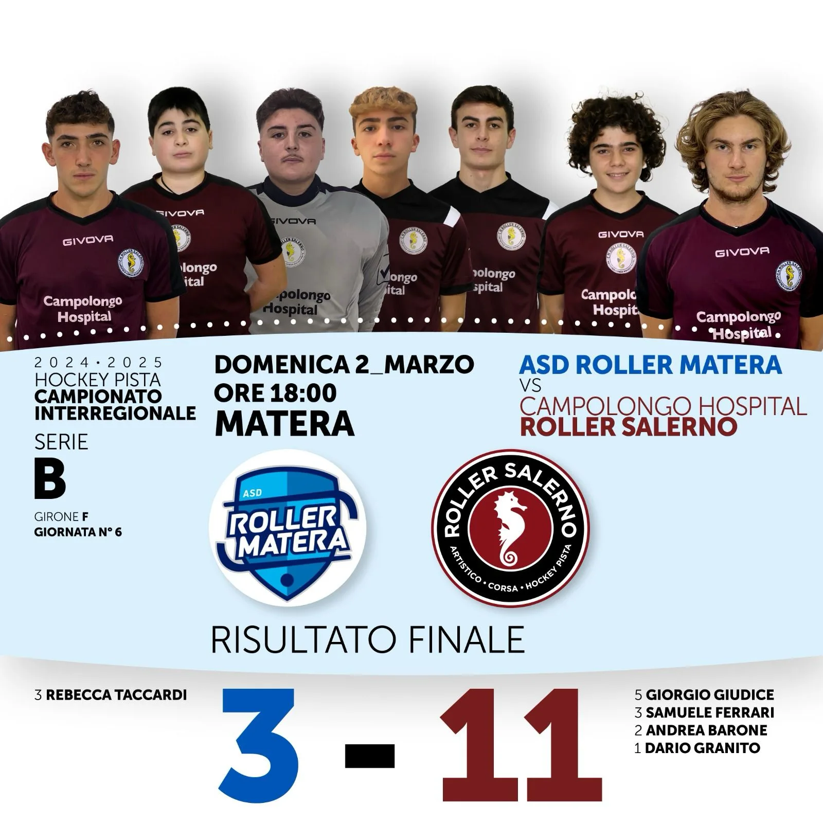 La Campolongo Hospital Roller Salerno continua la sua marcia trionfale nel campionato interregionale di Serie B. Domenica 2 marzo 2025, in trasferta, la squadra salernitana ha battuto la NEWCO Roller Matera con un netto 11-3, confermando il proprio dominio sulla competizione.