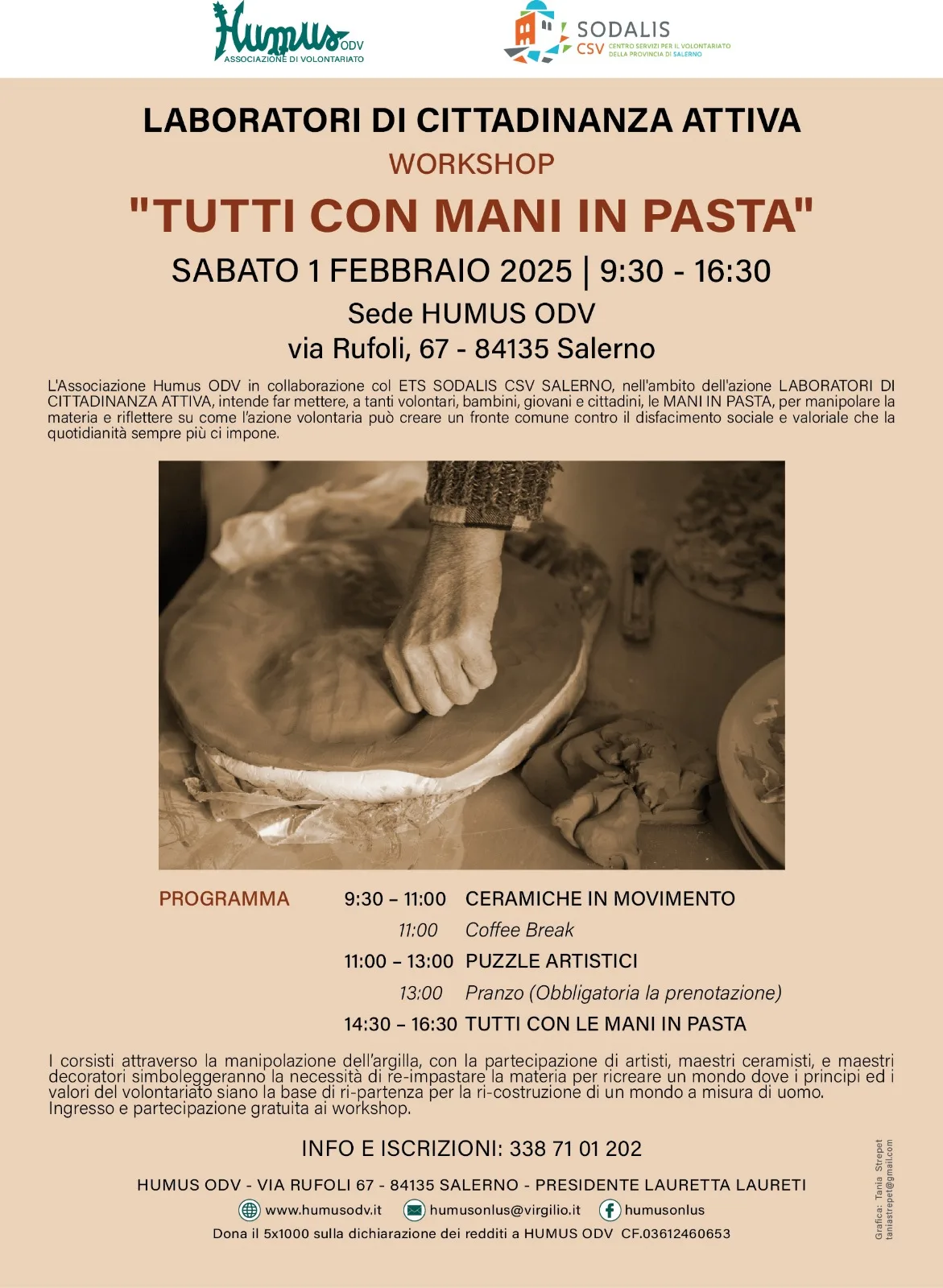 Sabato 1 febbraio dalle ore 9:30 sino alle ore 16:30 ci sarà il laboratorio di cittadinanza attiva con il Workshop ‘Tutti con mani in pasta’.