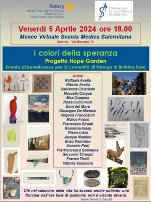 L ‘evento di beneficenza si terrà presso il museo virtuale della scuola medica salernitana venerdì 5 aprile alle ore 1800 in via Mercanti , 74. L’ asta di beneficenza servirà per creare un sito agro-silvo-pastorale nel villaggio di Niaogo in Burkina Faso in grado di produrre, in maniera autonoma ed ecologica: foraggio, frutta, carne e derivati. Le opere d’arte sono state donate da quotati artisti del nostro territorio.