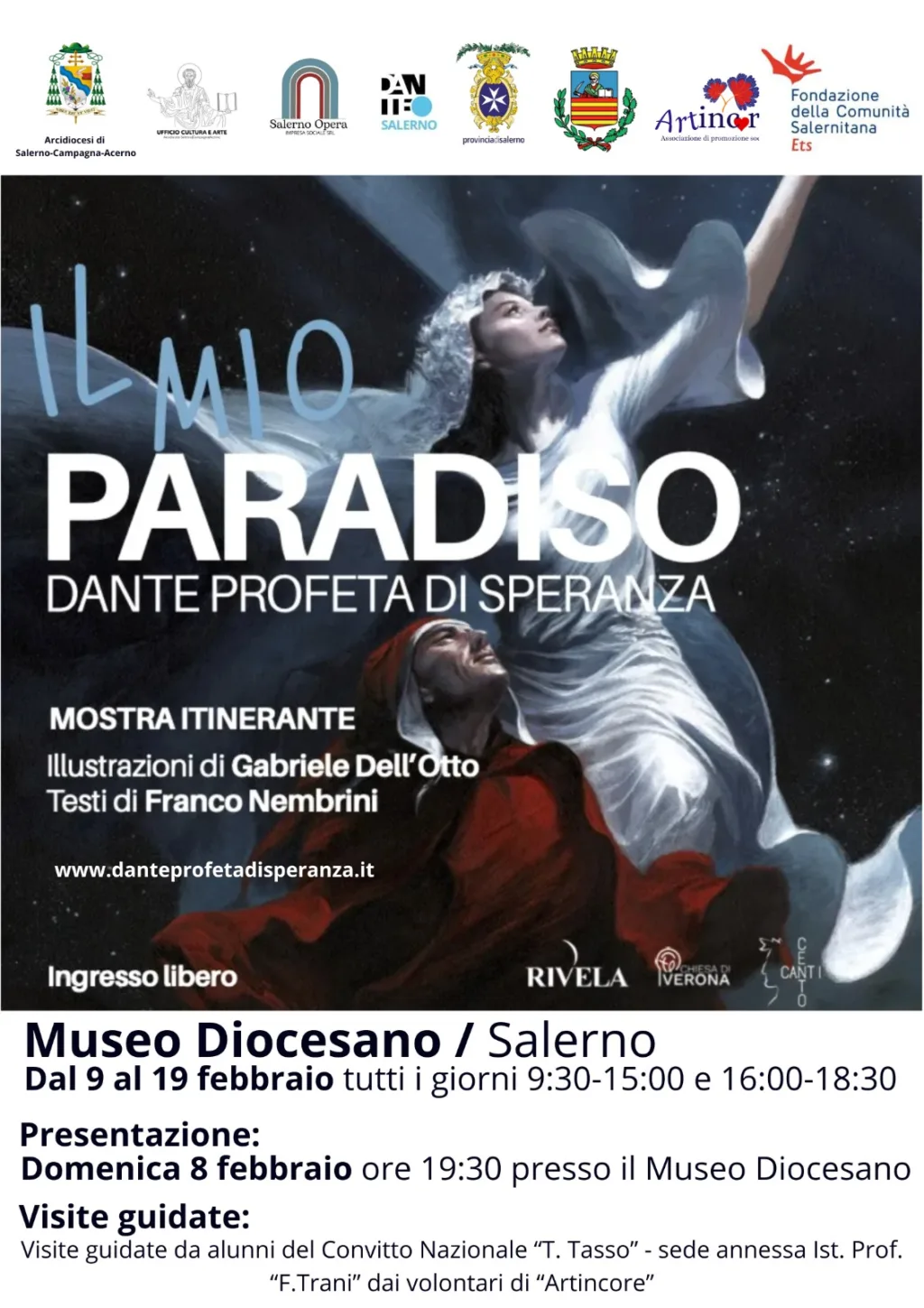 E’ in programma l’8 febbraio 2026 alle 19.30, presso il Museo Diocesano San Matteo di Salerno, con la partecipazione dell’Arcivescovo di Salerno-Campagna-Acerno, S.E. Monsignor Andrea Bellandi, la presentazione della mostra multimediale “Il mio Paradiso. Dante Profeta di Speranza”, un originalissimo percorso multisensoriale fatto di proiezioni di immagini, video e suoni. Organizzata dall’associazione “Artincore” in collaborazione con “Salerno opera impresa sociale srl” e promossa dall’Arcidiocesi di Salerno-Campagna-Acerno, attraverso l’Ufficio Cultura e Arte, la mostra gode del patrocinio di Provincia, Comune di Salerno, Società Dante Alighieri Salerno e Fondazione della Comunità Salernitana ets. Gli spazi del Museo Diocesano San Matteo, dunque, dal 9 al 19 febbraio 2026, ospiteranno il terzo capitolo del progetto multimediale, quest’anno dedicato a “Il mio Paradiso”, attraverso i commenti del saggista e pedagogista Franco Nembrini con le illustrazioni di Gabriele Dell’Otto. L’approdo all’Empireo completa il grande progetto che dal 2024 ha portato migliaia di persone, e soprattutto le nuove generazioni, a riscoprire l’attualità della figura di Dante come profeta di speranza.