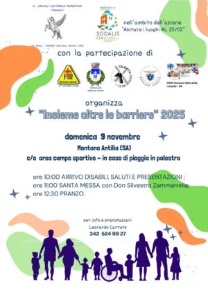 Domenica 9 novembre a Montano Antilia (SA) si terrà l’evento “Insieme oltre le barriere 2025”, una giornata dedicata all’inclusione e alla socializzazione. Avrà luogo nell’area campo sportivo e, in caso di maltempo, si sposterà nella palestra.