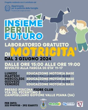 Le iniziative sono organizzate da Comune di San Cipriano Picentino e cooperativa sociale Fili d’Erba. Presso la piscina Fiore Club a Campigliano di Giffoni Valle Piana, dalle 15 alle 19, per la fascia d’età 11-17, educazione motoria di base nei giorni dispari e pallanuoto di base nei giorni pari.