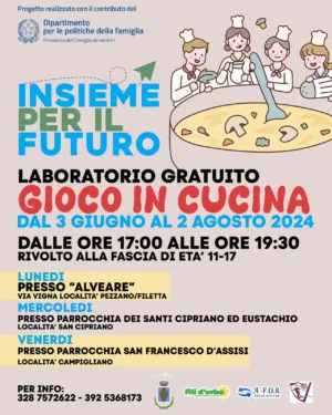 Nell’ambito dello stesso progetto, realizzato col contributo del dipartimento per le politiche della famiglia, dal 3 giugno al 3 agosto, partiranno laboratori gratuiti di gioco in cucina rivolti alla fascia d’età 11-17 anni. Dalle 17 alle 19 e 30 appuntamento il lunedì presso l’alveare in via Vigna di Pezzano/filetta, il mercoledì a San Cipriano presso la parrocchia dei Santi Cipriano ed Eustachio ed il venerdì a Campigliano presso la parrocchia San Francesco d’Assisi.