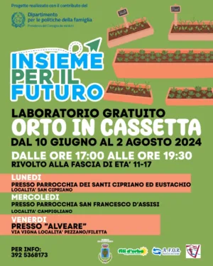 Infine, sempre per la fascia d’età 11-17, partirà un laboratorio di orto in cassetta, dal 10 giugno al 2 agosto. Appuntamento dalle 17 alle 19 e 30 il lunedì a San Cipriano, presso la parrocchia dei Santi Cipriano ed Eustachio, il mercoledì, presso la parrocchia San Francesco d’Assisi a Campigliano ed il venerdì presso l’Alveare in via Vigna in località Pezzano/Filetta. Per info. 329 53 68 173