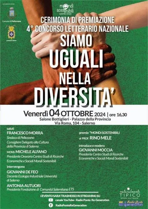 Venerdì 4 ottobre alle ore 16:30 presso il Salone Bottiglieri nel Palazzo della Provincia a Salerno, ci sarà la cerimonia di premiazione del concorso ‘Siamo uguali nella diversità’