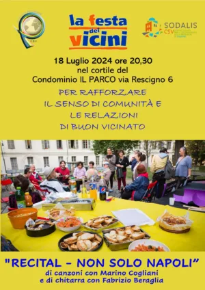 Il 18 luglio 2024, nel cortile del condominio IL PARCO, situata in Via Rescigno 6 a Salerno ci sarà un piccolo momento di condivisione per rafforzare le relazioni di buon vicinato, con ‘Recital – non solo Napoli’, canzoni di Marino Cogliani accompagnato dalla chitarra da Fabrizio Beraglia.