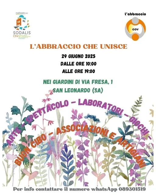 Domenica 29 giugno dalle ore 10 alle ore 19, presso i Giardini di Via Fresa 1 a San Leonardo ci sarà l’evento ‘L’abbraccio che unisce’. Un modo per gustare del buon cibo e tanto divertimento stando insieme.