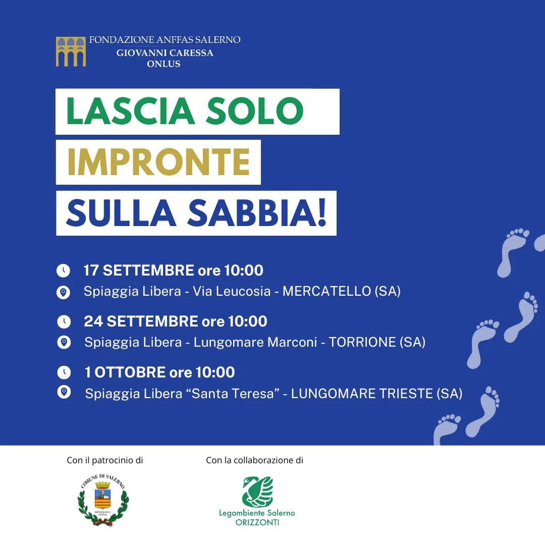 Tre giornate all’insegna della tutela ambientale, per aumentare la pulizia delle spiagge salernitane, promuovere la cura degli spazi pubblici della città di Salerno, abbattere le barriere sociali e promuovere l’inclusione sociale. Si parte martedì 17 settembre ore 10 presso la spiaggia libera in via Leucosia, in prossimità del Centro di Riabilitazione “Leucosia” della Fondazione Anffas Salerno. “Lascia solo impronte sulla sabbia”, è il progetto di pulizia delle spiagge pubbliche del litorale salernitano, promosso dalla Fondazione Anffas Salerno Giovanni Caressa Onlus, patrocinato dal Comune di Salerno, nato con l’obiettivo di sensibilizzare la comunità locale sull’importanza della tutela ambientale, coinvolgendo attivamente le persone con disabilità in un’azione concreta per la salvaguardia delle nostre spiagge.