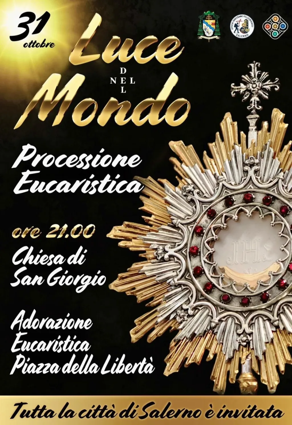 Queste le parole dell’Arcivescovo di Salerno-Campagna-Salerno, S.E. Monsignor Andrea Bellandi, nell’invitare la cittadinanza a partecipare alla Processione Eucaristica che partirà stasera, 31 ottobre, alle 21, dalla Chiesa di San Giorgio, per poi raggiungere Piazza della Libertà, dove seguirà un’intensa Adorazione Eucaristica.