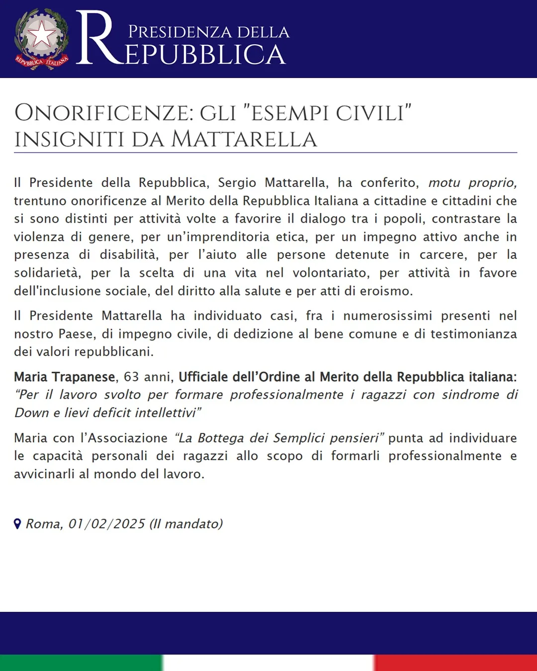 Il Presidente della Repubblica, Sergio Mattarella, ha conferito motu proprio 31 onorificenze al Merito della Repubblica Italiana a cittadine e cittadini distintisi per il loro impegno in favore dell’inclusione sociale, della solidarietà e del bene comune. Tra i meritevoli di questo prestigioso riconoscimento c’è Maria Trapanese, 63 anni, nominata Ufficiale dell’Ordine al Merito della Repubblica Italiana “per il lavoro svolto per formare professionalmente i ragazzi con sindrome di Down e lievi deficit intellettivi”.