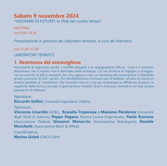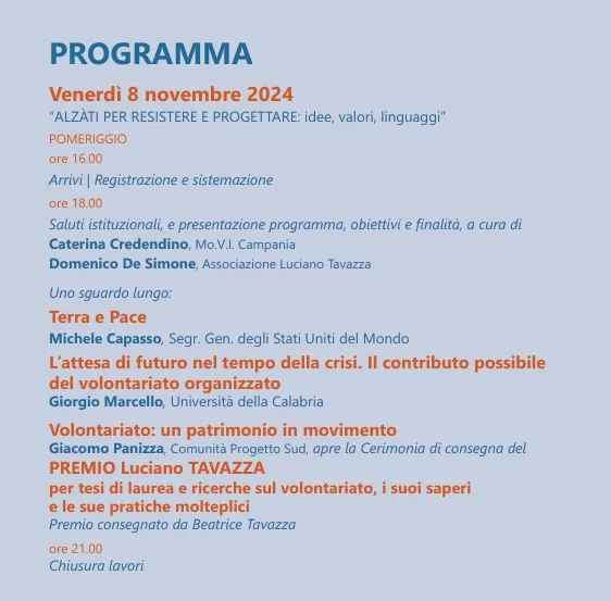 Dal giorno 8 al 10 novembre 2024, il mondo del volontariato si riunirà a Paestum, all’Hotel DELFA (Via Laura 7) dove idee e proposte si intrecceranno per dare vita a un movimento sempre più consapevole e propositivo, capace di incidere profondamente nel tessuto sociale e politico del nostro tempo.