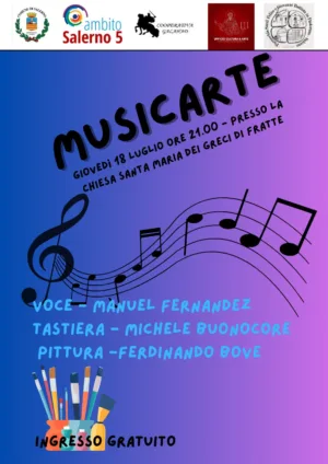Il giorno 18 luglio 2024, alle ore 21, presso la storica Chiesa Santa Maria dei Greci di Fratte (Salerno), “Musicarte”, suggestivo concerto a lume di candela con un’affascinante estemporanea di pittura. Nell’ambito delle attività promosse dal Centro per la Legalità della cooperativa sociale Galahad, con il patrocinio morale dell’Assessorato alle Politiche Sociali del Comune di Salerno e dell’Ufficio Cultura e Arte dell’Arcidiocesi di Salerno-Campagna-Acerno e in collaborazione con la Parrocchia Santi Felice e Giovanni in Pastorano, infatti, è stato organizzato un evento culturale gratuito, al fine di promuovere la storica chiesa di via Dei Greci, attraverso la musica e l’arte.