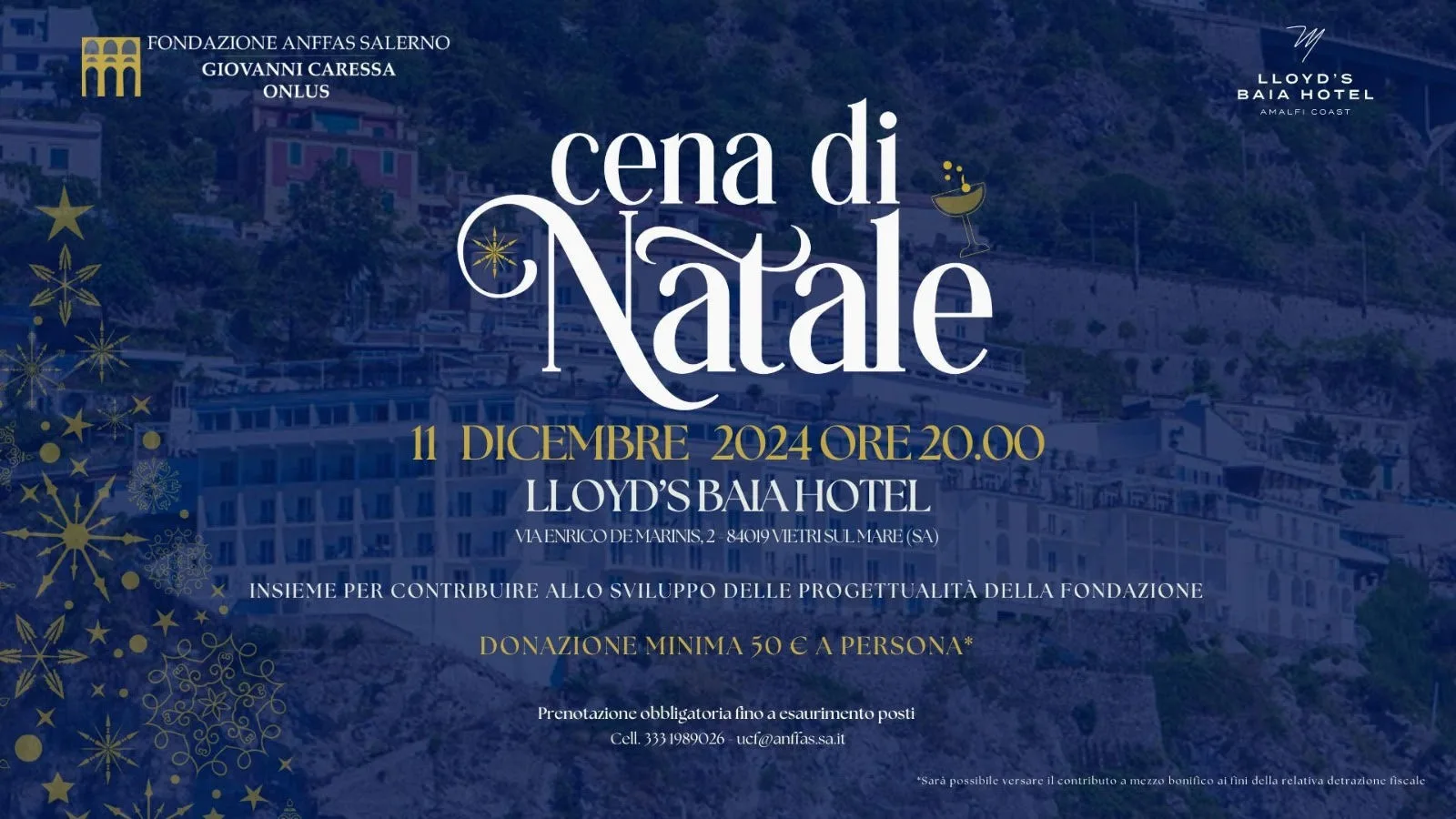 La Fondazione Anffas Salerno Giovanni Caressa, in occasione del Natale, mercoledì 11 dicembre al Lloyd’s Baia Hotel a Vietri sul Mare organizzerà la “Cena di Natale”. Ad illustrare nel corso della conferenza stampa la finalità del Progetto, il programma e gli ospiti dell’evento sarà Salvatore Parisi, Presidente Fondazione Anffas Salerno.