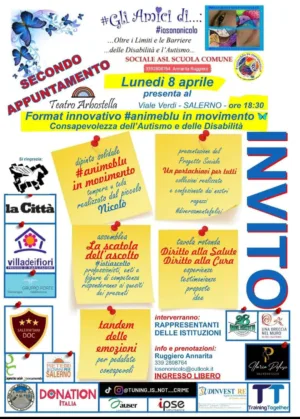 Il giorno 8 aprile alle ore 18:30, presso il Teatro Arbostella, viale Verdi Salerno, l’Associazione #Gli Amici di #iosononicolo – “Oltre i Limiti e le Barriere delle Disabilità dell’Autismo” organizza il 2° appuntamento del Format Innovativo #animeblu in movimento, #diversamentefelici Consapevolezza dell’Autismo e delle Disabilità. L’evento è inserito nel programma della seconda edizione della “Settimana dell’Autismo: un impegno Condiviso” a cura dell’ambito S5 Salerno e Pellezzano e Asl Salerno UONPIA Salerno.