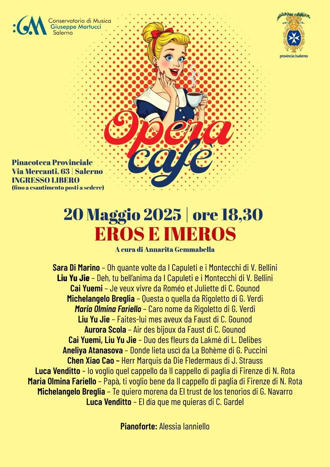 Martedì 20 maggio alle ore 18:30 alla Pinacoteca di Salerno (Via Mercanti 63,Salerno), ci sarà l’ottavo appuntamento della seconda edizione di Opera Cafè promosso dal Conservatorio Giuseppe Martucci di Salerno