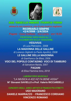 Il giorno 2 aprile alle ore 18:00, presso Casa Califano, in via Lamia ci sarà un evento in ricordo di Franco Tiano organizzato dall’associazione Tosello Madre Franco Tiano, per ricordarlo attraverso la sua musica.
