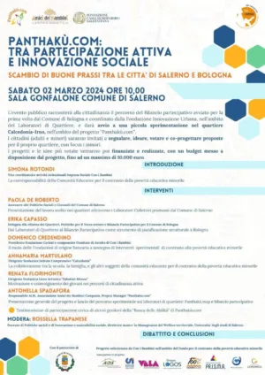 Con la presentazione del progetto Panthakù.com, che si terrà sabato 2 marzo alle ore 10:00, presso il Comune di Salerno nella Sala Confalone, si porterà a conoscenza dei cittadini il percorso del Bilancio partecipativo avviato dal Comune di Bologna e si darà avvio a una mini sperimentazione nel quartiere Calcedonia-Irno. I progetti e le idee più votate, saranno finanziate e realizzate con un budget di massimo 10.000.