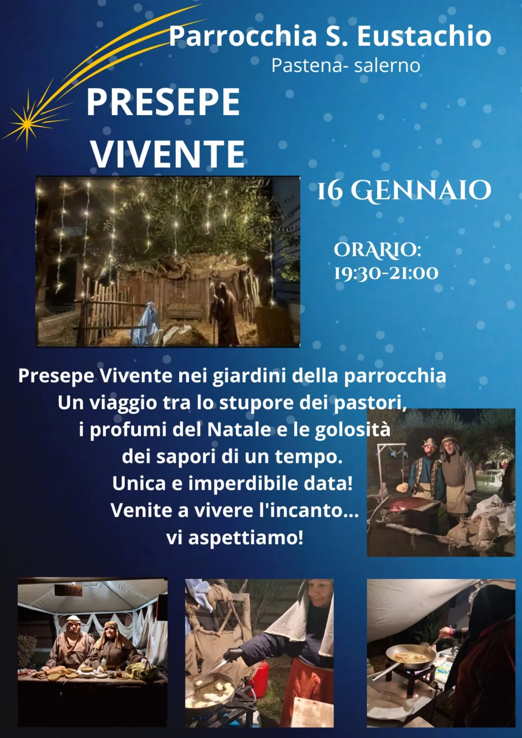 Venerdì 16 gennaio, dalle 19:30 alle 21:00, i giardini della Parrocchia di Sant’Eustachio, nel cuore di Pastena (Salerno), ospiteranno il Presepe Vivente, che in origine doveva svolgersi il 4 gennaio, ma posticipato per le cattive condizioni meteo.