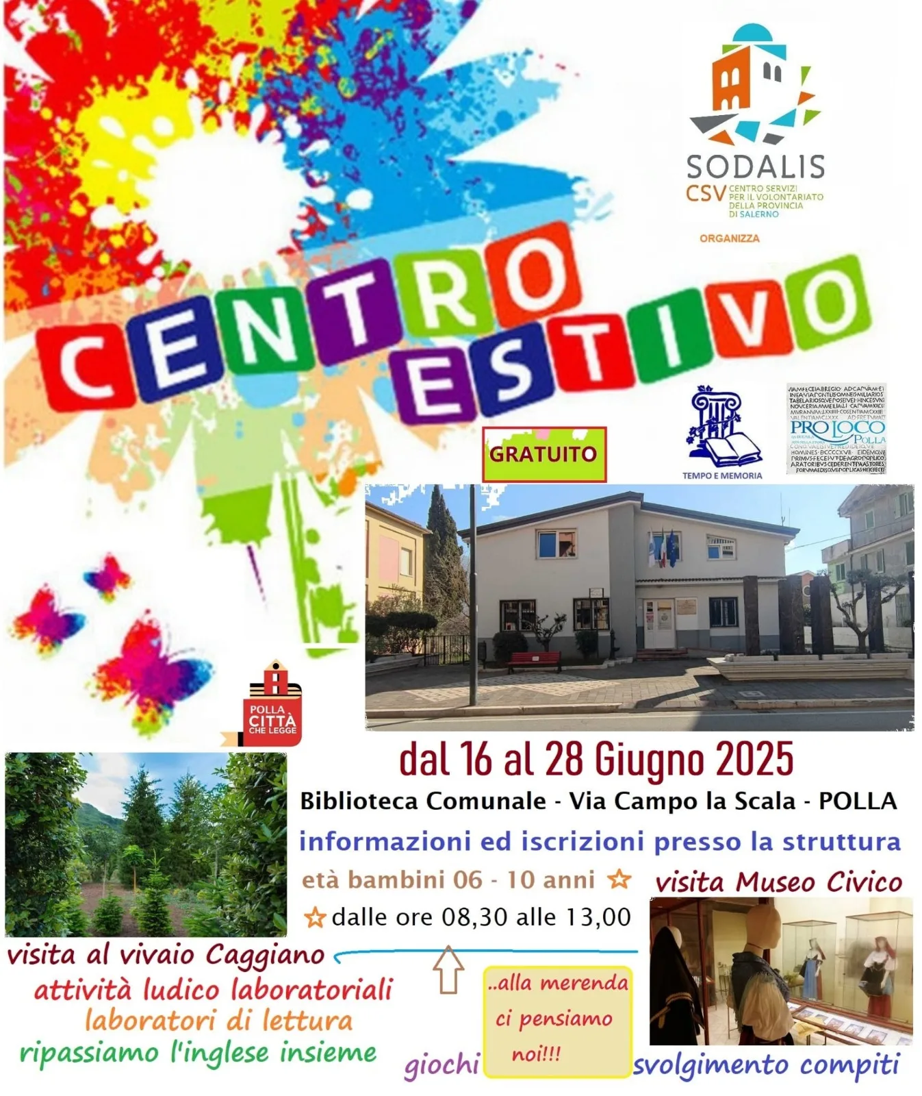 Dal 16 al 28 giugno la Sodalis CSV Salerno “Tempo e Memoria” e in collaborazione con la Pro Loco Polla mette in atto il Centro Estivo che si svolgerà presso la Biblioteca Comunale in Via Campo la Scala, Polla e comprenderà i bambini di età compresa tra i 6 e i 10 anni.