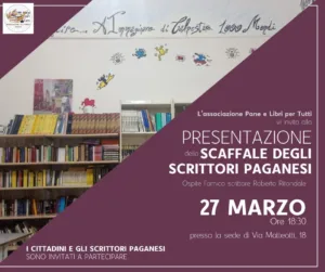 L’associazione Pane e Libri per Tutti, invita anche il cittadini e scrittori paganesi a partecipare alla presentazione, il giorno 27 marzo alle ore 18:30 presso la sede di Via Matteotti 18 a Pagani, dello Scaffale degli scrittori paganesi.