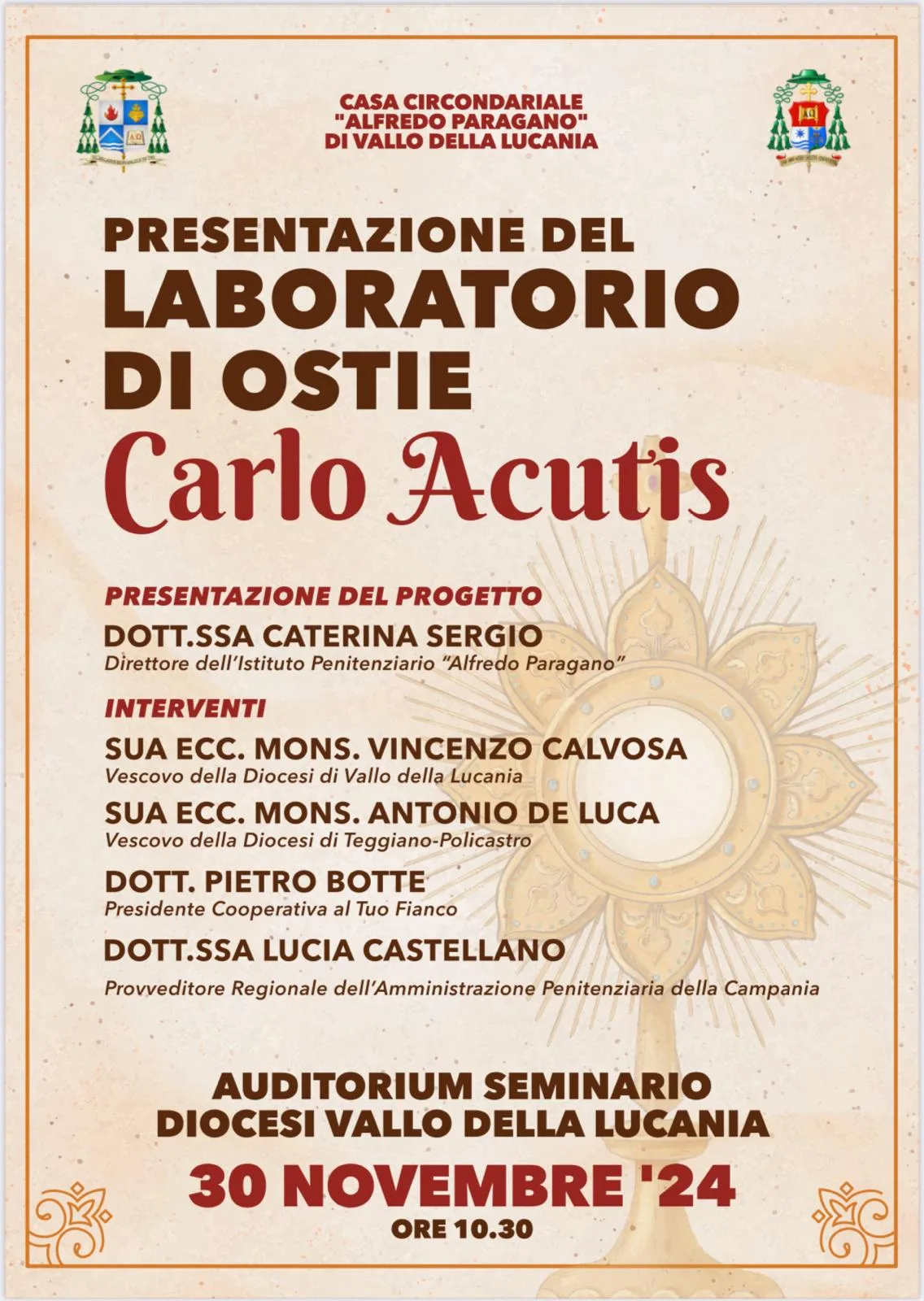 Sabato 30 novembre a partire dalle ore 10.30 presso l’auditorium della Diocesi di Vallo della Lucania, ci sarà la presentazione ed inaugurazione del laboratorio interno alla casa circondariale di Vallo e destinato alla produzione di ostie per il culto, intitolato al Beato Carlo Acutis. Un laboratorio denominato “Pane Quotidiano Carlo Acutis” che rientra nell’ambito di un progetto formativo-solidale che sarà illustrato dal direttore della casa circondariale “Alfredo Paragano” di Vallo della Lucania, Caterina Sergio.