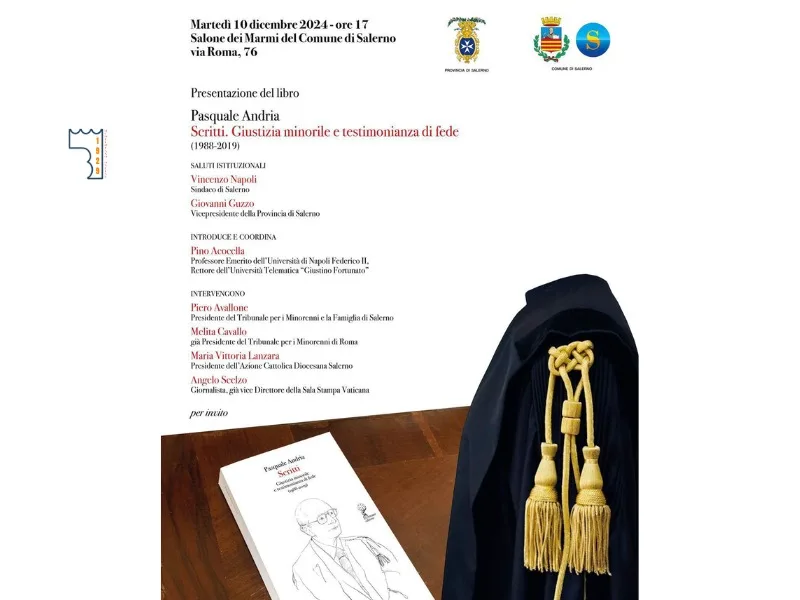 Martedì 10 dicembre alle 17 nel Salone dei Marmi del Palazzo di Città sarà presentato il libro di Pasquale Andria Scritti: Giustizia minorile e testimonianza di fede. La prima parte raccoglie alcuni contributi che il magistrato, scomparso nel dicembre dello scorso anno, pubblicò sul tema della giustizia minorile, nell’arco di un trentennio, in periodici specializzati, volumi collettanei e atti di convegni. La seconda, preceduta da una testimonianza di Marco Damilano, riporta una selezione di articoli tratti dalle riviste dell’Azione Cattolica “Presenza pastorale” e “Orientamenti sociali”, quest’ultima diretta da Andria dal 1997 al 2000. Il testo in appendice e una nota biografica prima di una serie di fotografie completano il corposo lavoro.