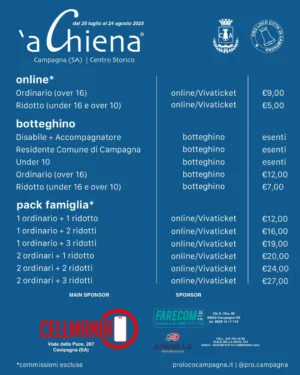 Per assistere all’EVENTO Chiena il costo del biglietto (onnicomprensivo dei servizi indicati) lo troverete su Vai su VivaTicket.